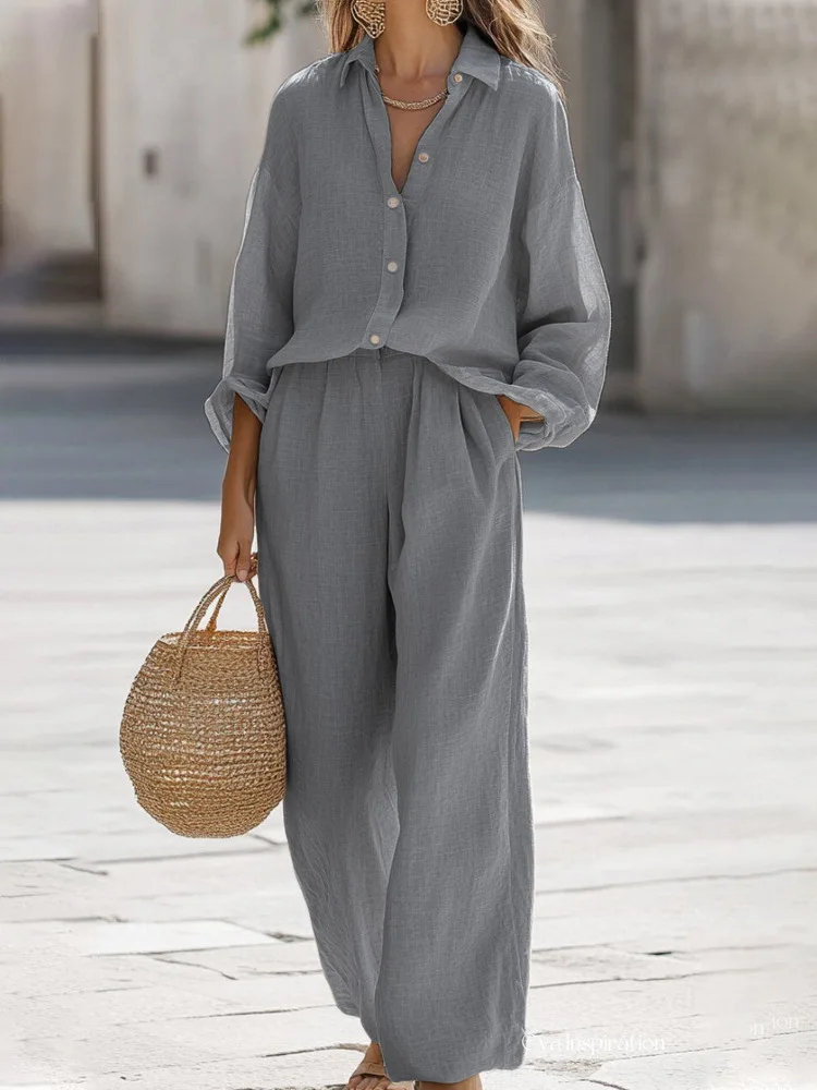 Simple Cotton Linen Women's Suits Summer Fashion Long Sleeve Loose Blouse Wide Leg Pants Two Piece Set For Women Casual Outfits